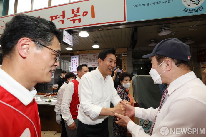 [서울=뉴스핌] 김민지 기자 = 오세훈 국민의힘 서울시장 후보가 24일 오후 서울 양천구 경창시장을 찾아 시민들과 인사를 나누고 있다. 왼쪽은 이기재 양천구청장 후보. 2022.05.24 kimkim@newspim.com