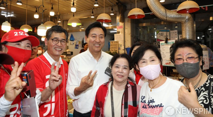 [서울=뉴스핌] 김민지 기자 = 오세훈 국민의힘 서울시장 후보가 24일 오후 서울 양천구 경창시장을 찾아 시민들과 사진을 찍고 있다. 2022.05.24 kimkim@newspim.com