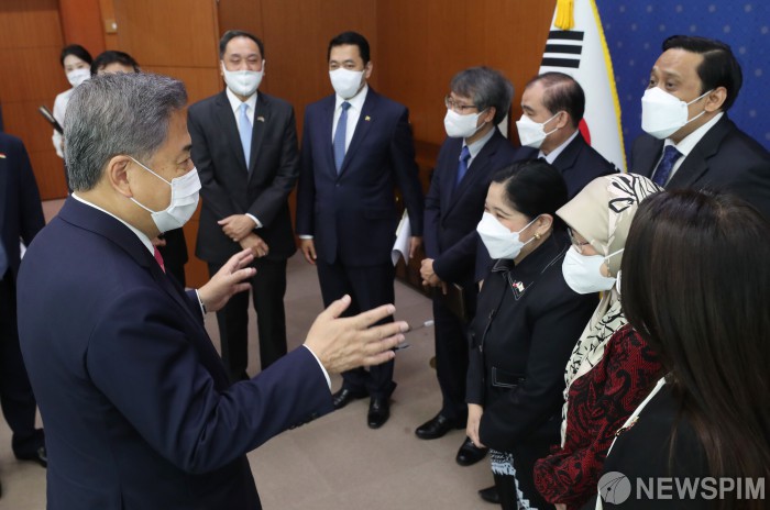 [서울=뉴스핌] 김학선 기자 = 박진 외교부 장관이 27일 서울 종로구 정부서울청사 외교부에서 주한 아세안 대사단과 만나 대화를 나누고 있다. 2022.05.27 yooksa@newspim.com