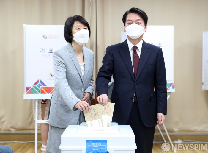 [성남=뉴스핌] 국회사진취재단 = 안철수 국민의힘 성남 분당갑 국회의원 후보자와 부인 김미경 교수가 27일 오전 경기도 성남시 분당구 야탑1동행정복지센터에 마련된 사전투표소에서 투표를 하고 있다. 2022.05.27 photo@newspim.com