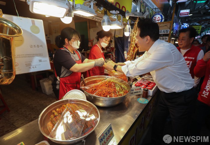 [서울=뉴스핌] 황준선 기자 = 오세훈 국민의힘 서울시장 후보가 27일 오후 서울 강북구 수유재래시장을 방문해 상인들과 인사를 하고 있다. 2022.05.27 hwang@newspim.com