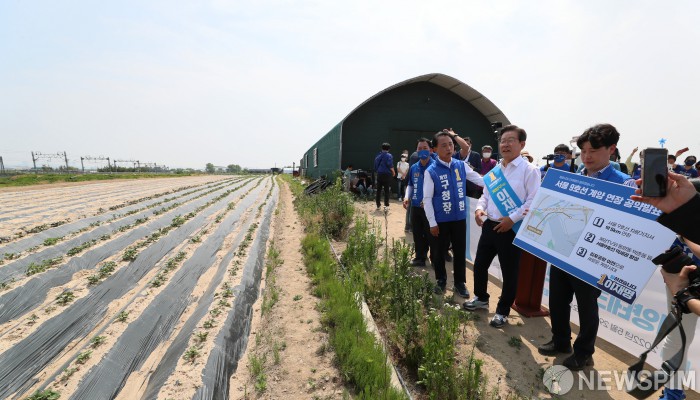 [인천=뉴스핌] 이형석 기자 = 이재명 더불어민주당 인천 계양을 국회의원 보궐선거 후보가 29일 인천 계양구 김포도시철도 기지창 인근에서 '지하철 9호선 계양 연장 공약'을 발표를 마친 후 기지창 주변을 둘려보고 있다. 2022.05.29 leehs@newspim.com