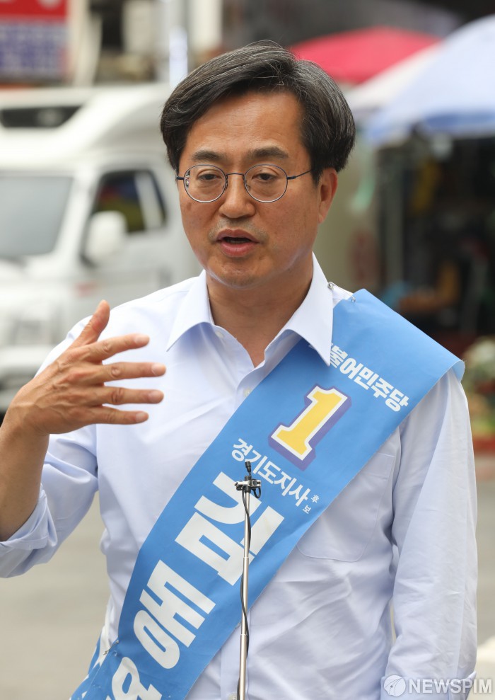 [이천=뉴스핌] 황준선 기자 = 김동연 더불어민주당 경기도지사 후보가 30일 오후 경기도 이천시 관고전통시장을 찾아 현장 연설을 하고 있다. 2022.05.30 hwang@newspim.com