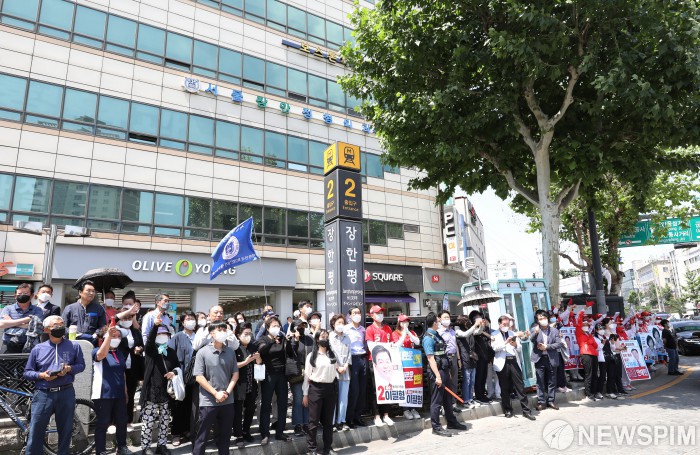 [서울=뉴스핌] 김민지 기자 = 31일 오후 서울 동대문구 장한평역에서 열린 오세훈 국민의힘 서울시장 후보 유세 현장에서 시민들이 오 후보의 발언을 듣고 있다. 2022.05.31 kimkim@newspim.com