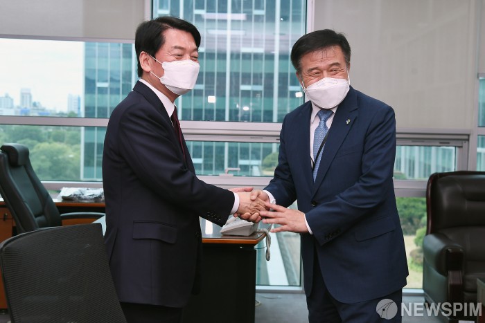 [서울=뉴스핌] 최상수 기자 = 안철수 국민의힘 의원이 7일 서울 여의도 국회 의원회관에서 의원실을 예방한 이진복 대통령실 정무수석과 인사를 나누고 있다. 2022.06.07 kilroy023@newspim.com