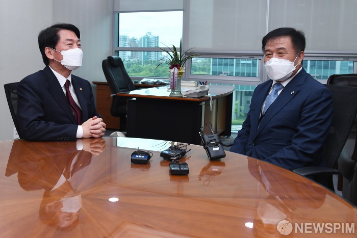 [서울=뉴스핌] 최상수 기자 = 안철수 국민의힘 의원이 7일 서울 여의도 국회 의원회관에서 의원실을 예방한 이진복 대통령실 정무수석과 대화를 나누고 있다. 2022.06.07 kilroy023@newspim.com