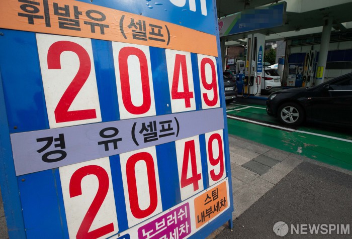 [서울=뉴스핌] 윤창빈 기자 = 국내 주유소에서 판매하는 휘발유와 경유 가격이 이틀 연속으로 역대 최고치를 기록했다. 유가정보서비스 오피넷에 따르면 오늘(12일) 오전 기준 휘발윳값은 리터당 2067.14원으로, 어제 10년 만에 기록한 역대 최고치보다 2.55원 더 올랐다. 국제유가 상승세를 고려할 때 국내 가격도 당분간 계속 오를 전망이다. 사진은 이날 오후 서울 시내의 한 주유소. 2022.06.12 pangbin@newspim.com