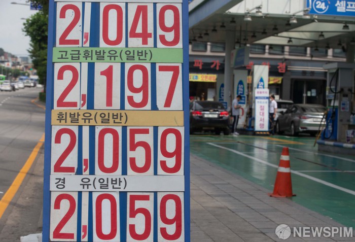 [서울=뉴스핌] 윤창빈 기자 = 국내 주유소에서 판매하는 휘발유와 경유 가격이 이틀 연속으로 역대 최고치를 기록했다. 유가정보서비스 오피넷에 따르면 오늘(12일) 오전 기준 휘발윳값은 리터당 2067.14원으로, 어제 10년 만에 기록한 역대 최고치보다 2.55원 더 올랐다. 국제유가 상승세를 고려할 때 국내 가격도 당분간 계속 오를 전망이다. 사진은 이날 오후 서울 시내의 한 주유소. 2022.06.12 pangbin@newspim.com
