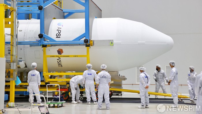 [서울=뉴스핌] 지난 8일부터 9일까지 누리호 1, 2단과 3단의 최종 결합 작업이 나로우주센터 발사체조립동에서 진행됐다. [사진=한국항공우주연구원] 2022.06.13 photo@newspim.com