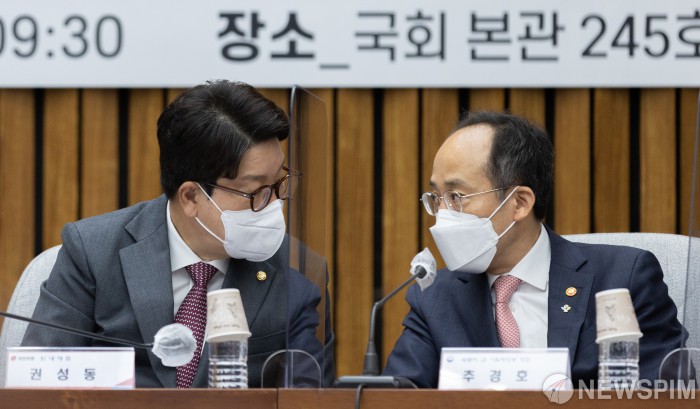 [서울=뉴스핌] 김민지 기자 = 권성동 국민의힘 원내대표와 추경호 부총리 겸 기획재정부 장관이 15일 오전 서울 여의도 국회에서 열린 제3차 당정협의회에서 대화를 하고 있다. 2022.06.15 kimkim@newspim.com