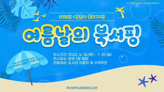 [부산=뉴스핌] 남동현 기자 = 부산시립중앙도서관은 다음달 31일까지 도서관 1층 로비에서 어린이를 대상으로 여름 관련 도서와 함께 도서를 즐길 수 있는 '여름날의 북서핑' 북큐레이션을 운영한다고 16일 밝혔다.