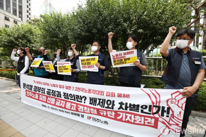 [서울=뉴스핌] 정일구 기자 = 민주노총 관계자들이 22일 오전 서울 서대문구 경찰청 앞에서 민주노총 집회 선별 금지통고 경찰청 규탄 기자회견을 열고 구호를 외치고 있다. 2022.06.22 mironj19@newspim.com