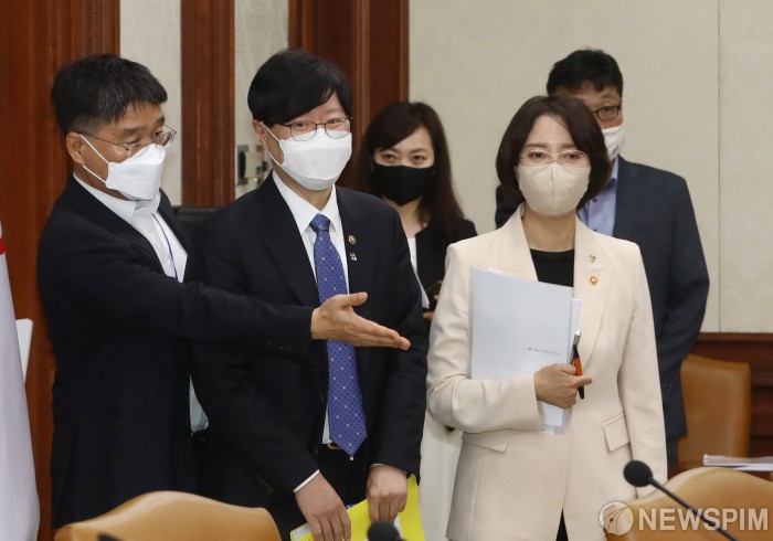 [서울=뉴스핌] 김민지 기자 = 이영 중소벤처기업부 장관(오른쪽 두번째)과 김소영 금융위원회 부위원장(왼쪽 두번째)이 23일 오전 서울 종로구 정부서울청사에서 열린 제2차 비상경제장관회의에 참석하고 있다. 2022.06.23 kimkim@newspim.com