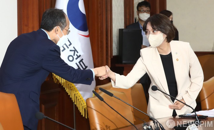[서울=뉴스핌] 김민지 기자 = 추경호 부총리 겸 기획재정부 장관과 이영 중소벤처기업부 장관이 23일 오전 서울 종로구 정부서울청사에서 열린 제2차 비상경제장관회의에서 인사를 나누고 있다. 2022.06.23 kimkim@newspim.com