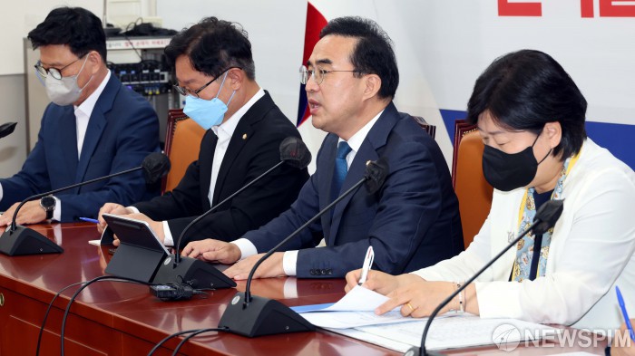 [서울=뉴스핌] 김민지 기자 = 박홍근 더불어민주당 원내대표가 28일 오전 서울 여의도 국회에서 열린 윤석열 정권 검경농단 저지 대책회의에서 발언하고 있다. 2022.06.28 kimkim@newspim.com