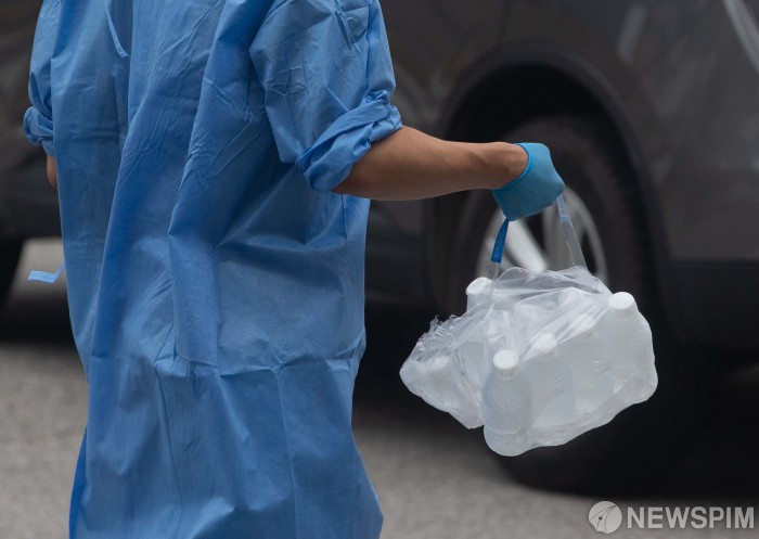 [서울=뉴스핌] 윤창빈 기자 = 코로나19 재유행 조짐이 보이고 있는 7일 오전 서울 강남구 강남구보건소에 마련된 코로나19 선별진료소에서 의료진이 폭염에 대비해 생수를 옮기고 있다. 코로나19 확진자는 3월 17일, 62만여 명으로 정점을 찍은 뒤 감소세를 이어갔지만 지난달 27일 이후 다시 증가하기 시작했다. 이날 0시 기준 코로나19 확진자는 18,511명 증가했다. 2022.07.07 pangbin@newspim.com