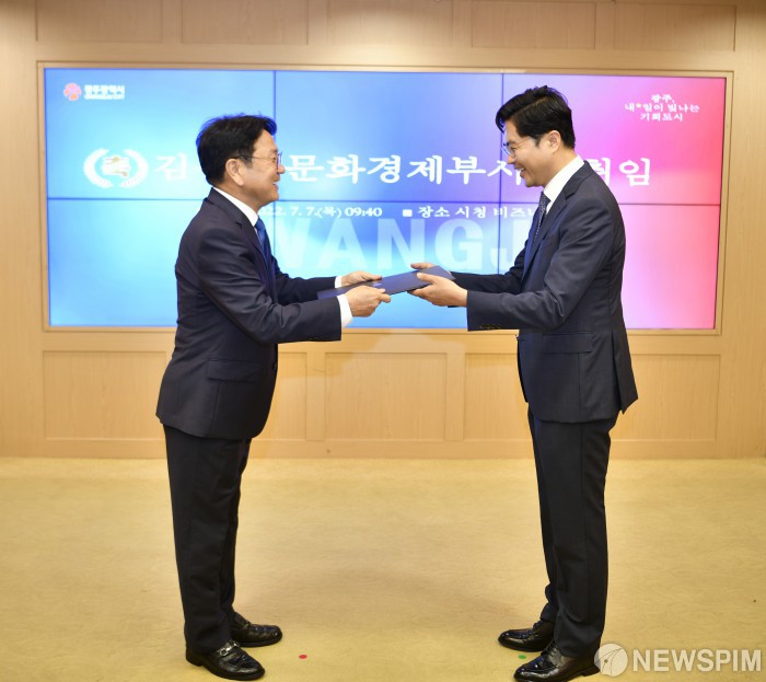 [광주=뉴스핌] 전경훈 기자 = 강기정 광주시장이 7일 오전 광주시청 비즈니스룸에서 열린 김광진 문화경제부시장 취임식에서 임명장을 전달하고 있다. 2022.07.07 kh10890@newspim.com