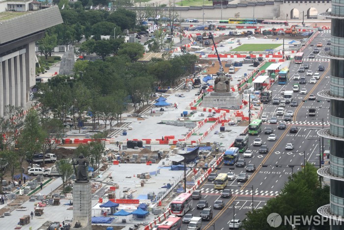 [서울=뉴스핌] 김학선 기자 = 7일 대대적인 확장 공사를 진행하며 재개장을 앞둔 서울 광화문광장에서 작업자들의 막바지 공사가 한창이다. 2022.07.07 yooksa@newspim.com