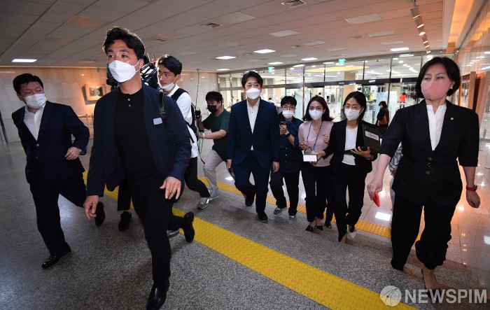 [서울=뉴스핌] 최상수 기자 = 이준석 국민의힘 대표가 7일 서울 여의도 국회에서 열린 '성 상납 증거 인멸 교사' 의혹 관련 중앙윤리위원회에 출석하고 있다. 2022.07.07 kilroy023@newspim.com