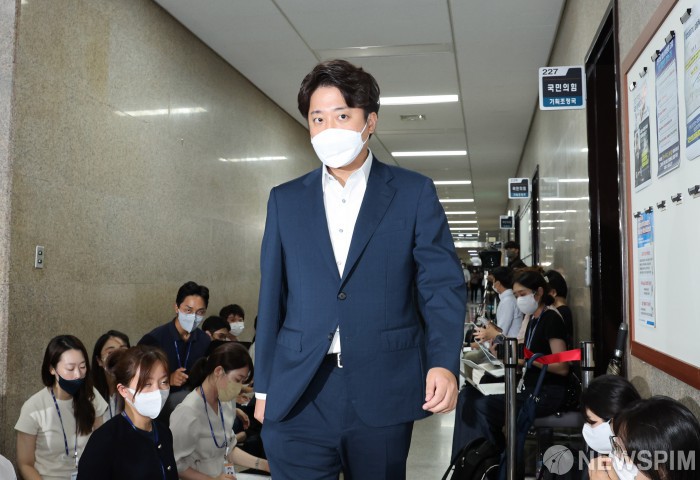 [서울=뉴스핌] 최상수 기자 = 이준석 국민의힘 대표가 7일 서울 여의도 국회에서 열린 '성 상납 증거 인멸 교사' 의혹 관련 중앙윤리위원회에 출석하기 전 입장을 밝히고 있다. 2022.07.07 kilroy023@newspim.com