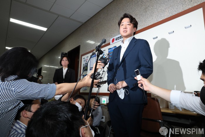 [서울=뉴스핌] 최상수 기자 = 이준석 국민의힘 대표가 7일 서울 여의도 국회에서 열린 '성 상납 증거 인멸 교사' 의혹 관련 중앙윤리위원회에 출석하기 전 입장을 밝히고 있다. 2022.07.07 kilroy023@newspim.com