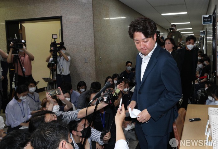 [서울=뉴스핌] 최상수 기자 = 이준석 국민의힘 대표가 7일 서울 여의도 국회에서 열린 '성 상납 증거 인멸 교사' 의혹 관련 중앙윤리위원회에 출석하기 전 입장을 밝히고 있다. 2022.07.07 kilroy023@newspim.com