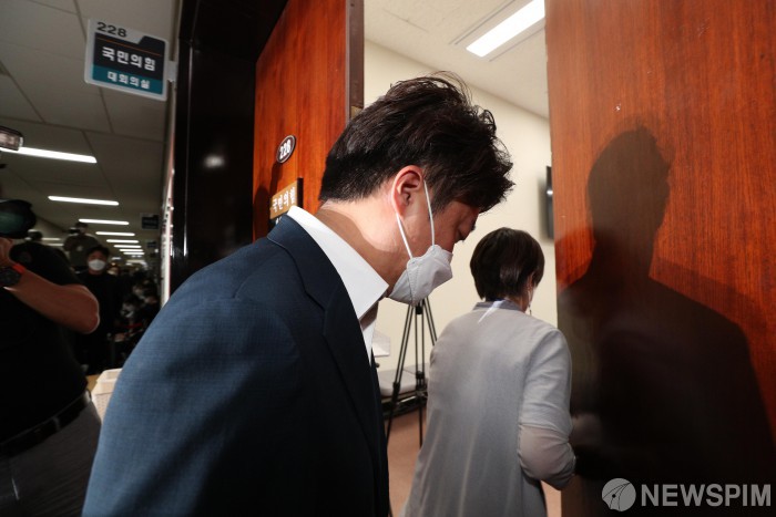 [서울=뉴스핌] 최상수 기자 = 이준석 국민의힘 대표가 7일 서울 여의도 국회에서 열린 '성 상납 증거 인멸 교사' 의혹 관련 중앙윤리위원회에 출석하기 전 입장을 밝히고 있다. 2022.07.07 kilroy023@newspim.com