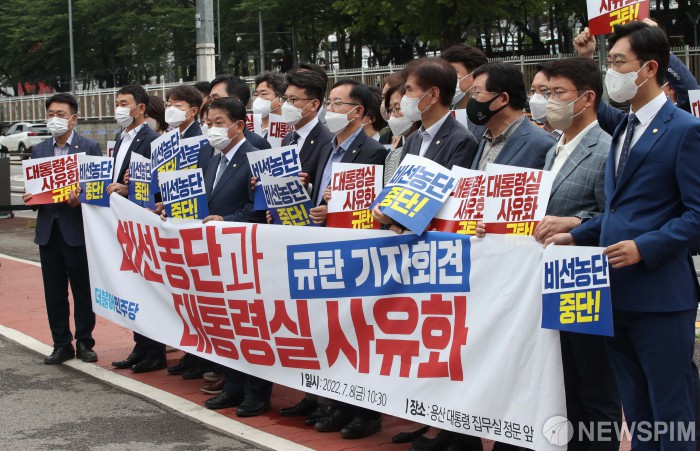 [서울=뉴스핌] 국회사진취재단 = 더불어민주당 원내대표단 의원들이 8일 오전 서울 용산구 대통령실 앞에서 비선 농단과 대통령실 사유화를 규탄하는 기자회견을 열고 구호를 외치고 있다. 2022.07.08 photo@newspim.com