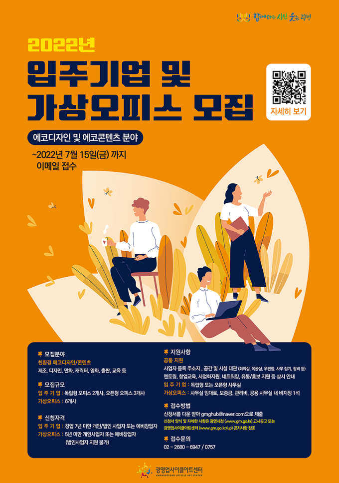 신청을 원하는 기업은 광명시청 누리집 고시공고를 참조하여 신청서를 내려 받은 후 오는 15일까지 이메일로 제출하면 된다. 입주기업 및 가상오피스에 중복 지원이 가능하고 지원 분야 모두 합격 시 입주 기업에 우선 선정된다.