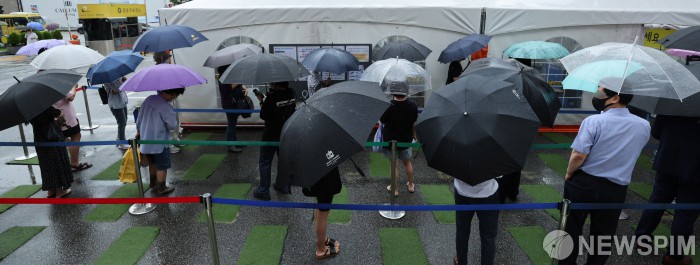 [서울=뉴스핌] 윤창빈 기자 = 13일 오전 서울 강남구 보건소에 마련된 코로나19 선별진료소에서 시민들이 검사를 받기 위해 줄을 서고 있다. 이날 코로나19 신규 확진자는 전주의 2.1배인 4만266명으로 63일만에 4만명을 넘어섰다. 2022.07.13 pangbin@newspim.com
