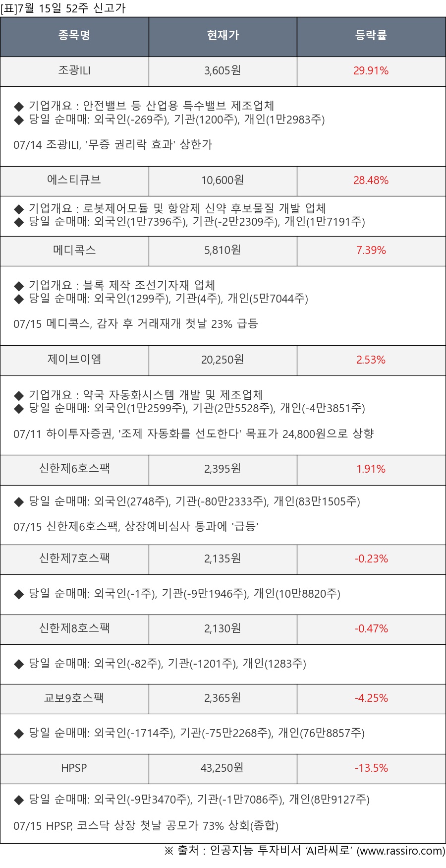 ※ 관련 종목: 조광ILI, 에스티큐브, 메디콕스, 제이브이엠, 신한제6호스팩, 신한제7호스팩, 신한제8호스팩, 교보9호스팩, HPSP