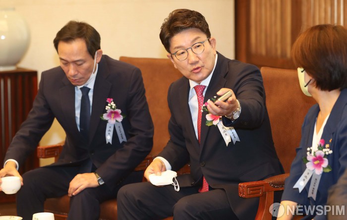 [서울=뉴스핌] 윤창빈 기자 = 권성동 국민의힘 대표 직무대행 겸 원내대표가 17일 서울 여의도 국회 의장 접견실에서 제74주년 제헌절인 경축행사를 앞두고 김진표 국회의장 등 5부요인, 여야 정당 대표와 가진 환담에서 대화를 나누고 있다. 2022.07.17 pangbin@newspim.com