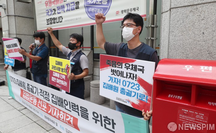 [서울=뉴스핌] 김학선 기자 = 민주노총 공공운수노조 전국민주우체국본부 회원들이 19일 오전 서울 종로구 광화문우체국 앞에서 열린 '0723 집배원 총궐기 및 적정 집배인력 확충 입법운동 선포' 기자회견에서 구호를 외치고 있다. 2022.07.19 yooksa@newspim.com