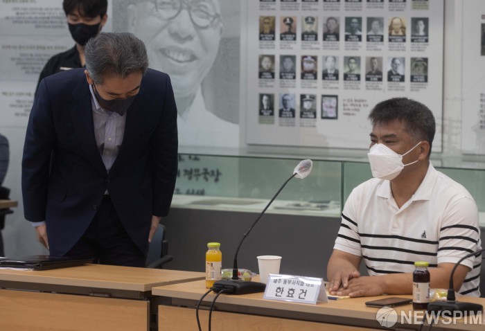 [서울=뉴스핌] 윤창빈 기자 = 윤희근 경찰청장 후보자가 21일 오전 서울 서대문구 경찰청에서 열린 경찰청장 후보자와 전국 직협대표 등 간담회에서 고개숙여 인사하고 있다. 2022.07.21 pangbin@newspim.com