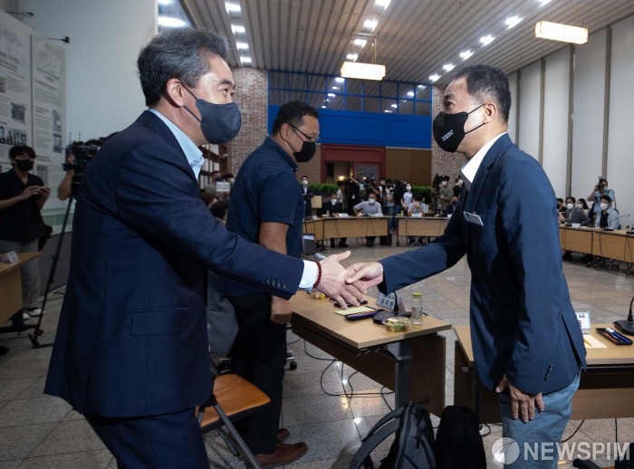 [서울=뉴스핌] 윤창빈 기자 = 윤희근 경찰청장 후보자가 21일 오전 서울 서대문구 경찰청에서 열린 경찰청장 후보자와 전국 직협대표 등 간담회에서 참석자와 인사를 나누고 있다. 2022.07.21 pangbin@newspim.com