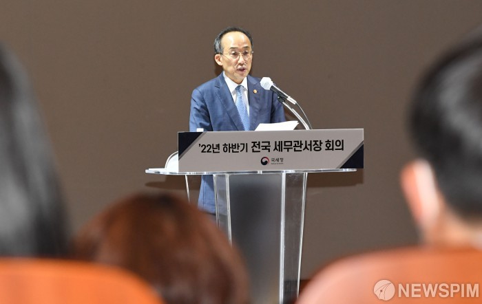 [서울=뉴스핌] 추경호 부총리 겸 기획재정부 장관이 22일 국세청에서 열린 전국 세무관서장 회의에 참석해 치사를 하고 있다. [사진=기획재정부] 2022.07.22 photo@newspim.com