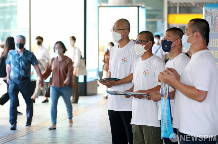 [서울=뉴스핌] 정일구 기자 = 경찰직장협의회 관계자들이 25일 오전 서울 중구 서울역에서 행정안전부의 경찰국 신설에 반대하는 대국민 홍보전을 진행하고 있다. 2022.07.25 mironj19@newspim.com