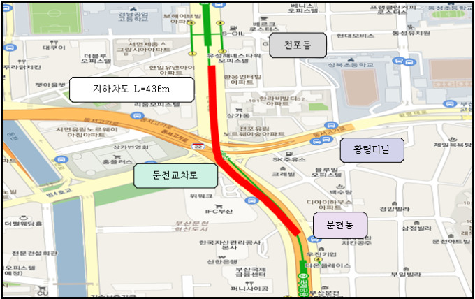 개통한 문전지하차도는 부산진구 전포지구대에서 남구 부산국제금융센터를 통과하는 총길이 436m의 편도 2차로의 지하차도로 총 사업비 282억원(국비 138억원, 시비 144억원)이 투입됐다.