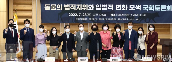 [서울=뉴스핌] 최상수 기자 = 더불어민주당 박홍근 원내대표와 한정애 동물복지국회포럼 공동대표 등 참석자들이 28일 국회 의원회관에서 열린 '동물의 법적 지위와 입법적 변화 모색 국회 토론회'에서 기념촬영을 하고 있다. (공동취재사진) 2022.07.28 photo@newspim.com
