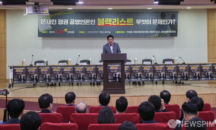 [서울=뉴스핌] 최상수 기자 = 권성동 국민의힘 대표 직무대행 겸 원내대표가 29일 서울 여의도 국회 의원회관에서 열린 '공영언론 블랙리스트 논란 무엇이 문제인가 토론회'에서 격려사를 하고 있다. 2022.07.29 kilroy023@newspim.com