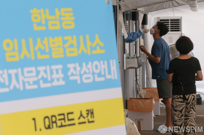 [서울=뉴스핌] 황준선 기자 = 코로나19의 재확산으로 철거됐던 한남동 임시선별검사소가 다시 운영을 시작한 29일 오후 서울 용산구 한남동 임시선별검사소를 찾은 시민들이 코로나19 검사를 기다리고 있다. 2022.07.25 hwang@newspim.com