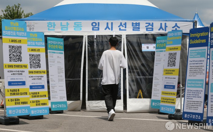 [서울=뉴스핌] 황준선 기자 = 코로나19의 재확산으로 철거됐던 한남동 임시선별검사소가 다시 운영을 시작한 29일 오후 서울 용산구 한남동 임시선별검사소를 찾은 시민이 검사소로 들어서고 있다. 2022.07.25 hwang@newspim.com