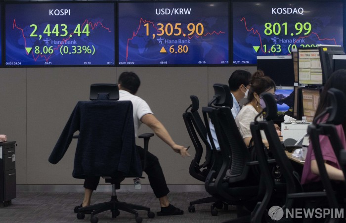 [서울=뉴스핌] 윤창빈 기자 = 1일 코스피는 전 거래일(2451.50)보다 7.45포인트(0.30%) 내린 2444.05에 장을 열었다. 코스닥지수는 전 거래일(803.62)보다 0.53포인트(0.07%) 오른 804.15에 거래를 시작했다. 서울 외환시장에서 원·달러 환율은 전 거래일(1299.1원)보다 4.9원 상승한 1304.0원에 출발했다. 사진은 이날 오전 서울 중구 하나은행 딜링룸의 모습. 2022.08.01 pangbin@newspim.com