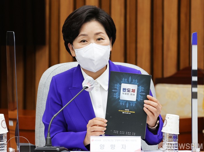 [서울=뉴스핌] 김민지 기자 = 양향자 반도체산업 경쟁력강화 특별위원회 위원장이 1일 오후 서울 여의도 국회에서 열린 반도체 산업 경쟁력 강화를 위한 당·정 정책협의회에서 활동 및 성과보고 홍보자료를 들고 설명을 하고 있다. (공동취재사진) 2022.08.01 kimkim@newspim.com