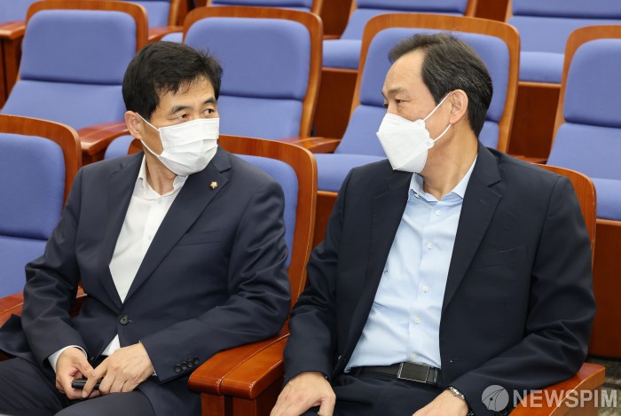 [서울=뉴스핌] 김민지 기자 = 우상호 더불어민주당 비상대책위원장과 김민기 사무총장이 2일 오후 서울 여의도 국회에서 열린 의원총회에서 대화를 나누고 있다. (공동취재사진) 2022.08.02 photo@newspim.com