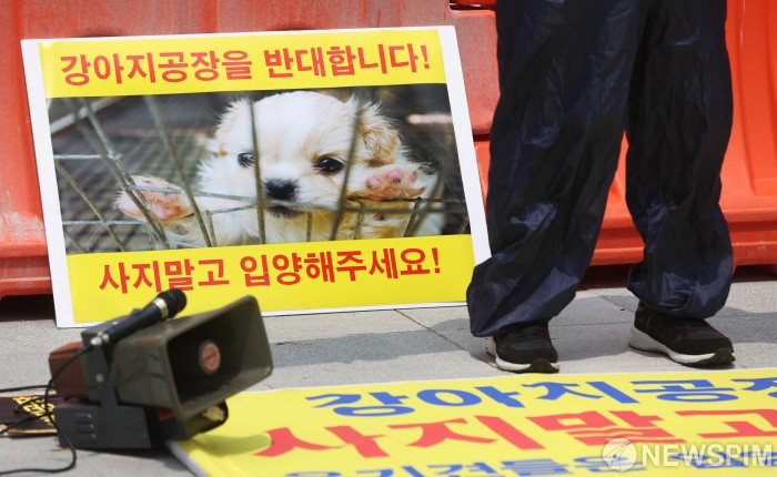 [서울=뉴스핌] 김민지 기자 = 한국동물보호연합 관계자들이 4일 오후 서울 종로구 광화문광장 인근에서 '반려동물 사지말고 입양해주세요 기자회견'을 열고 유기견 입양을 촉구하고 있다. 2022.08.04 kimkim@newspim.com