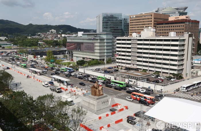 [서울=뉴스핌] 김민지 기자 = 광화문광장 재개장을 하루 앞둔 5일 오후 서울 종로구 광화문광장에서 막바지 작업이 이뤄지고 있다. 광화문광장 재개장은 재구조화 공사를 시작한 지 1년 9개월 만이다. 2022.08.05 kimkim@newspim.com