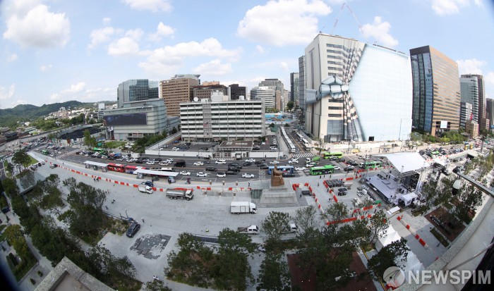 [서울=뉴스핌] 김민지 기자 = 광화문광장 재개장을 하루 앞둔 5일 오후 서울 종로구 광화문광장에서 막바지 작업이 이뤄지고 있다. 광화문광장 재개장은 재구조화 공사를 시작한 지 1년 9개월 만이다. 2022.08.05 kimkim@newspim.com