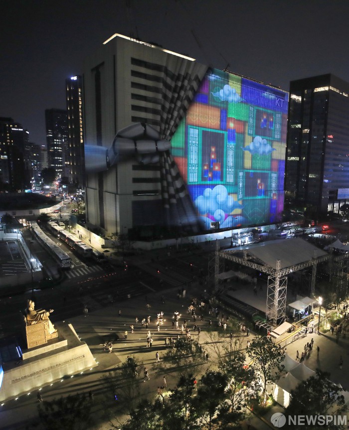 [서울=뉴스핌] 이형석 기자 = 6일 밤 서울 종로구 광화문광장에서 열린 빛모락 개장 기념행사에서 미디어파사드가 공개되고 있다. 2022.08.06 leehs@newspim.com