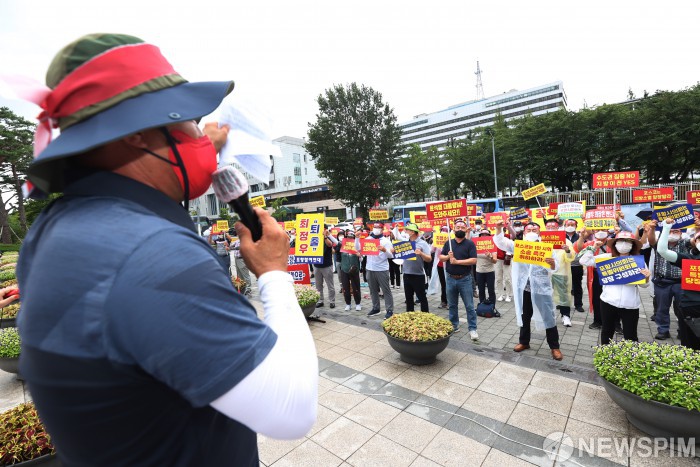 [서울=뉴스핌] 김민지 기자 = 포스코 지주사 포항이전 범시민대책위원회 회원들이 8일 오전 서울 용산구 대통령 집무실 인근에서 포스코홀딩스·미래기술연구원 포항시 이전 촉구 집회를 열고 구호를 외치고 있다. 2022.08.08 kimkim@newspim.com